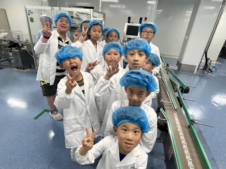 緊接著孩子們來(lái)到了小容量注射劑1號(hào)車(chē)間。在進(jìn)入生產(chǎn)區(qū)的剎那,透過(guò)巨大的玻璃展窗,孩子們發(fā)出陣陣驚嘆——儲(chǔ)水罐猶如高大威猛的巨人,佇立在光亮整潔的制水間內(nèi)。注射液的誕生之路便從這里開(kāi)始。在滅菌間內(nèi),孩子們對(duì)巨大的鐵柜子充滿了好奇,它就是飽和蒸汽滅菌柜,是藥支“蒸桑拿”的地方。孩子們?cè)谶@里學(xué)習(xí)到了溫度與微生物之間的親密關(guān)系。在燈檢間內(nèi),巨大的星輪圓盤(pán)與隊(duì)列整齊的藥支們?cè)V說(shuō)著質(zhì)量第一的故事。最后,在包裝間內(nèi),從分托入托機(jī)到裝箱機(jī),藥支們陸續(xù)穿上漂亮的服裝,成功誕生為完整的產(chǎn)品。孩子們了解到,每一支注射劑的誕生,都是科技與智慧的結(jié)晶,是保護(hù)人類健康的超級(jí)英雄。